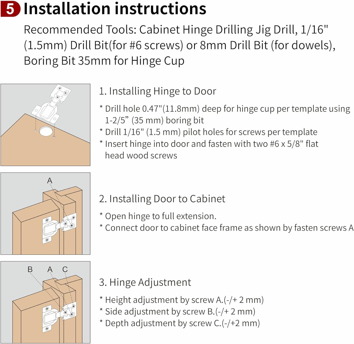 Cabinet Type: Face Frame Opening Angle: 105° Hinge Cup Diameter: 35mm(1-2/5”) Hinge Cup Depth: 11.8mm(12/25″) Screw Hole Distance: 45mm(1-4/5”) Overlay: 1/2 inch overlay Range of Door Thickness:14-26mm Mounting type: Screw-on or with dowels