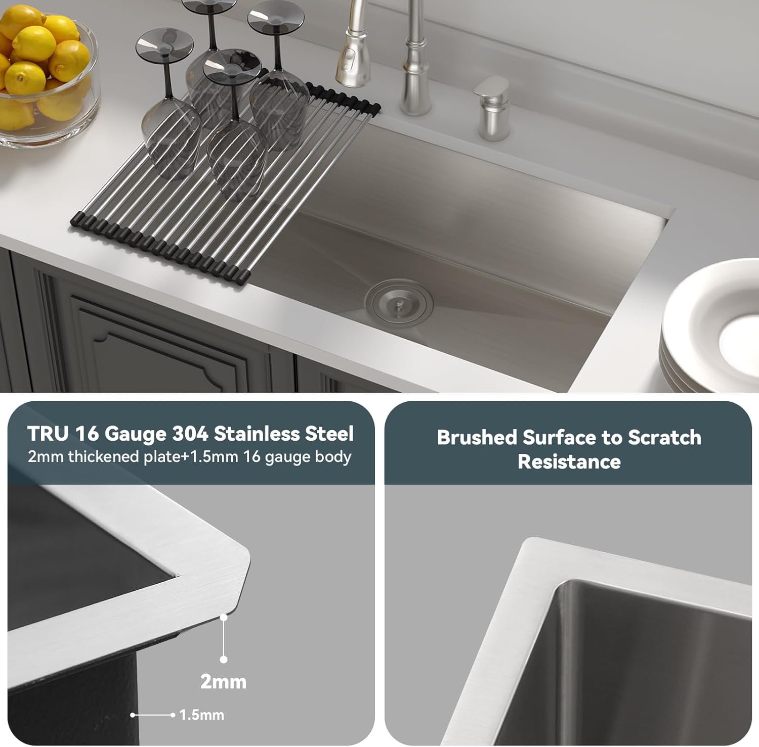 ROUND CORNER+BRUSED SURFACE — This stainless steel undermount kitchen sink is designed with R10 radius corners to prevent corner stain accumulation, more easier in cleaning. Commercial grade brushed surface makes our kitchen sink more functional in resisting scratches and more charming, fits well with all kinds of countertop.