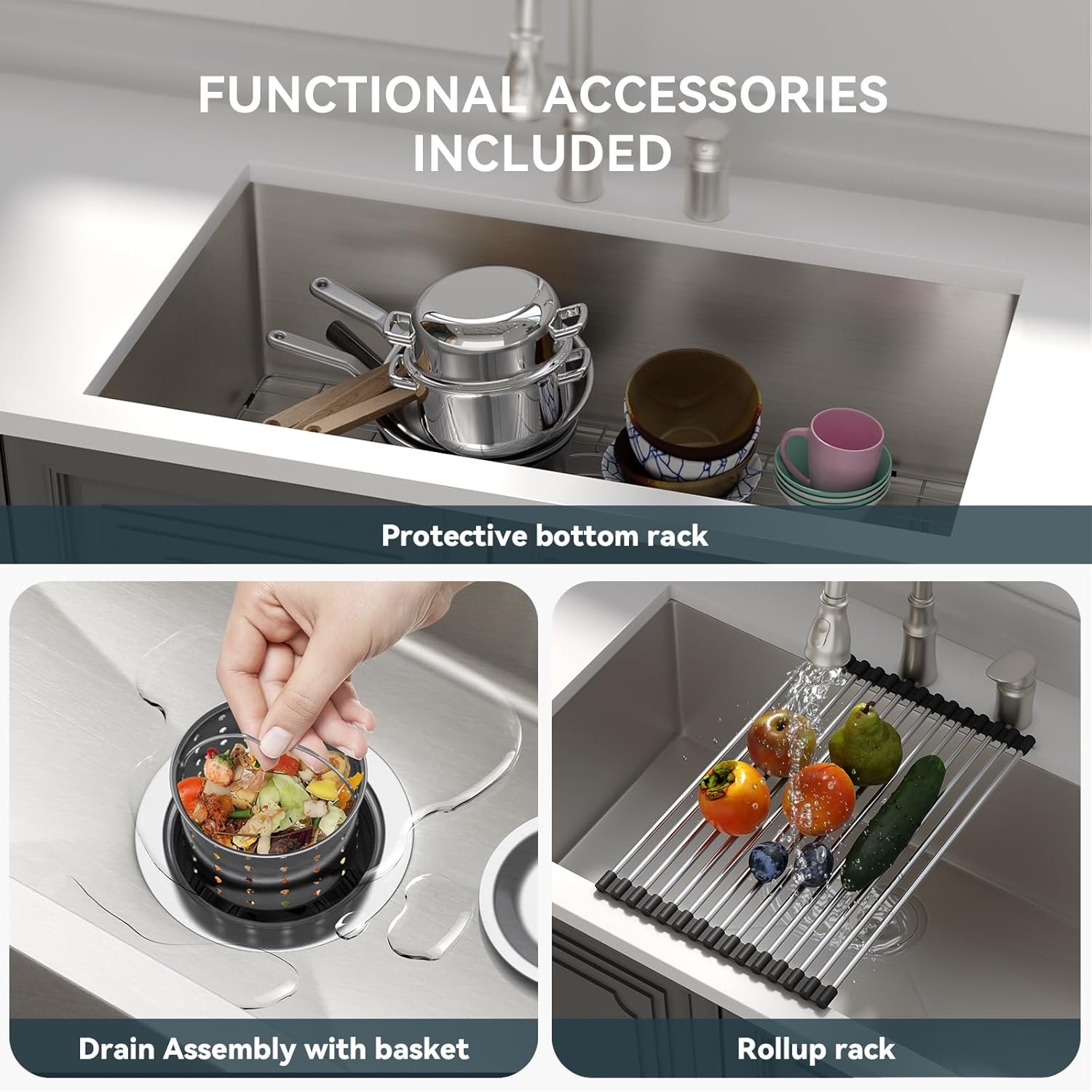 KITCHEN SINK SIZE & PACKAGE—External Size: 32*19*10 inch; What’s in the box: Include a stainless steel kitchen sink, 1×304 stainless steel protective bottom grid, 1x drain assembly with basket, 1x drying rack, clips/ cutout template and installation instruction.