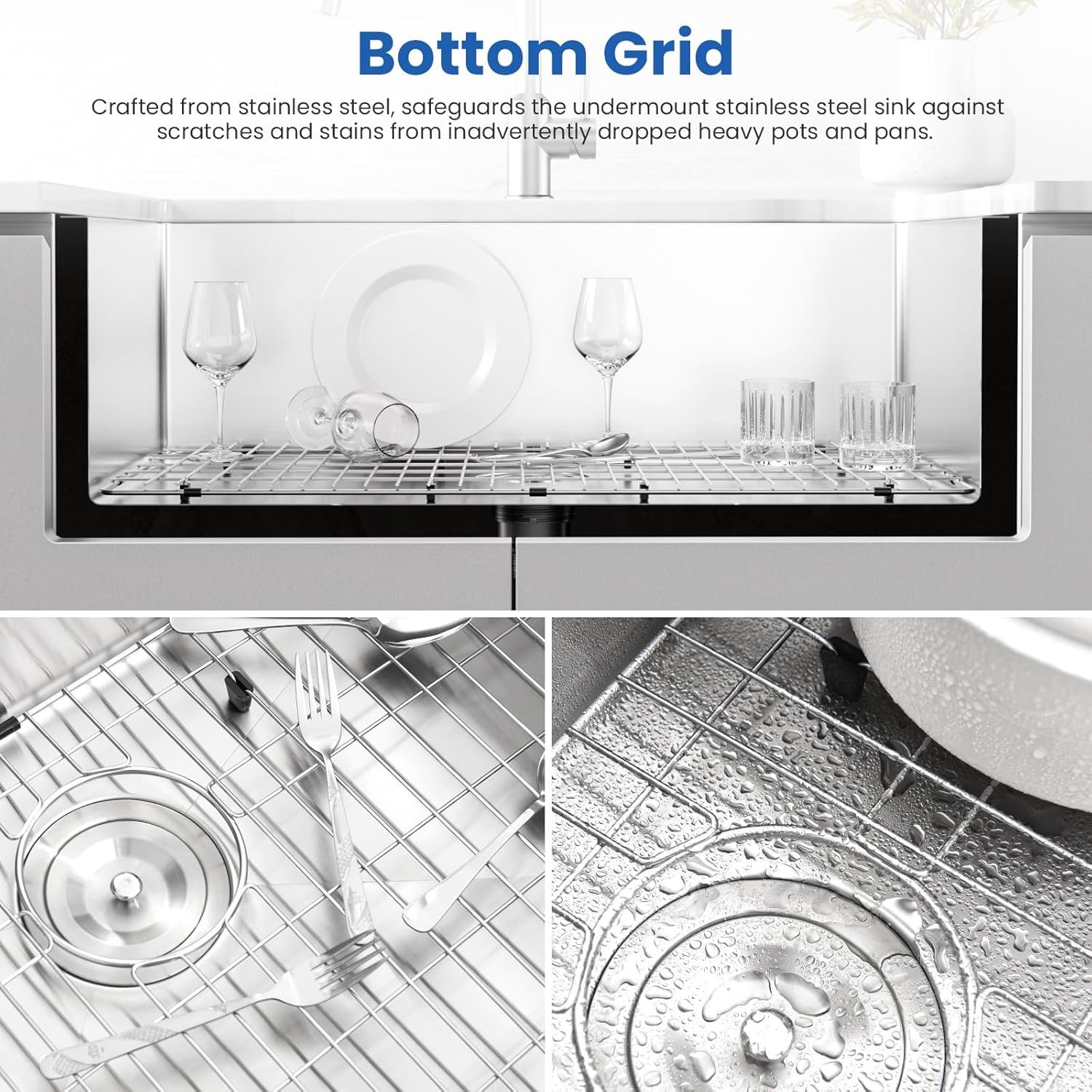 Undermount Installation: The undermount kitchen sink is installed beneath the countertop creating a seamless appearance. Including mounting hardware, pamphlets and installation guidance, Multi-functional stainless steel dish grid protects sink bottom, and the 3-piece basket strainer for waste management.