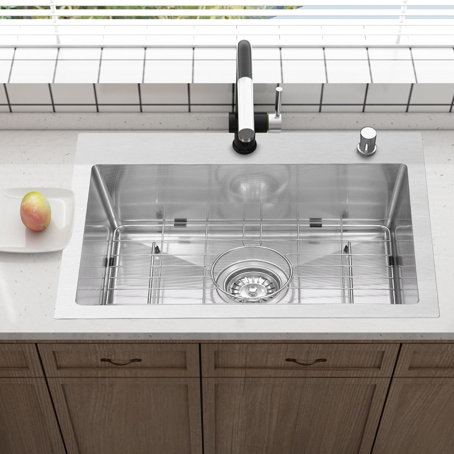 EASY INSTALLATION: Designed for a simple drop-in installation, this sink can be easily mounted into your existing countertop, making it a convenient and stylish upgrade for your kitchen. Enhance your kitchen experience with the included accessories – a bottom grid, drain assembly with strainer
