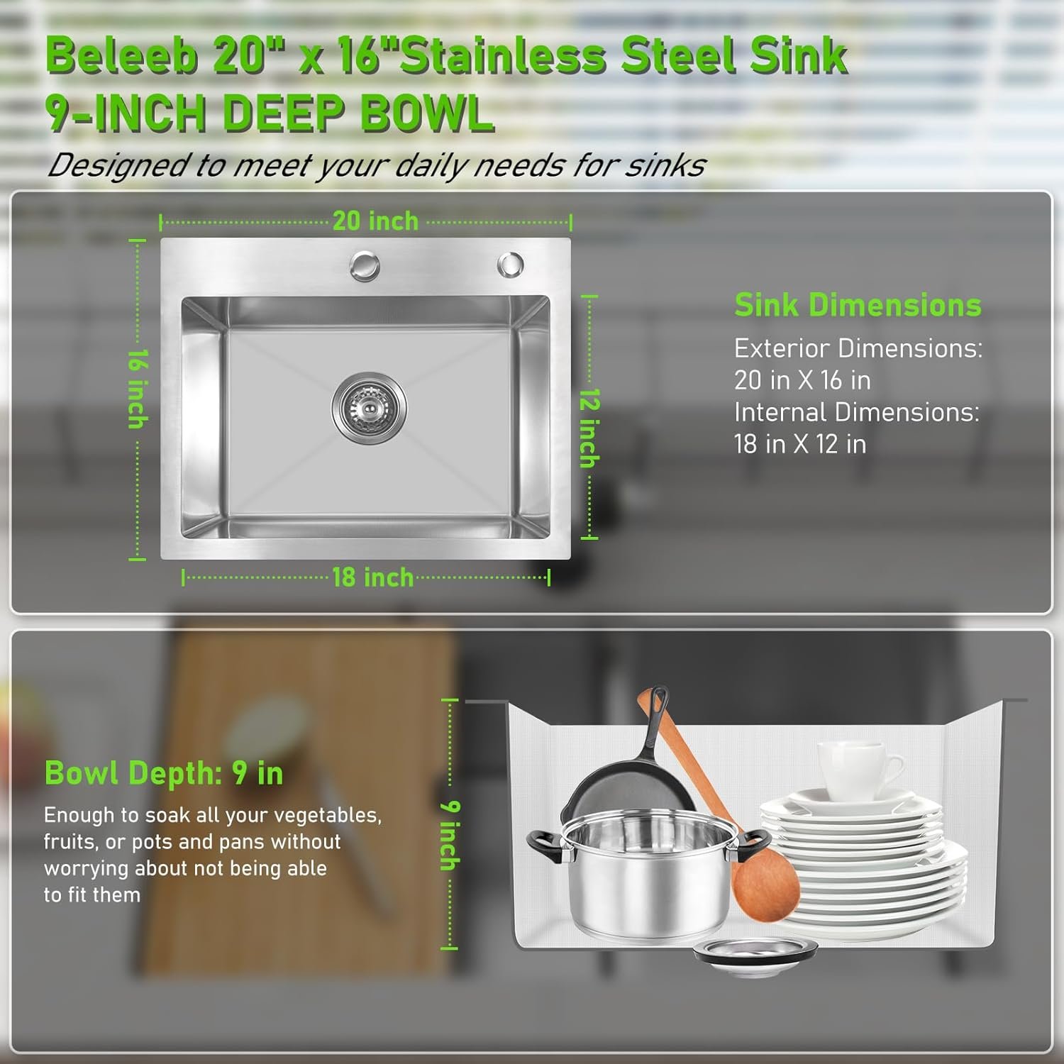 SPACIOUS BOWL: Exterior Dimensions: 20″ x 16″. Internal Dimensions(Desktop Opening Size): 18″ x 12″. Bowl Depth: 9″. With its generous bowl size, the Beleeb Drop-In Sink provides ample space for your largest pots and pans, making it perfect for both daily cooking tasks and entertaining