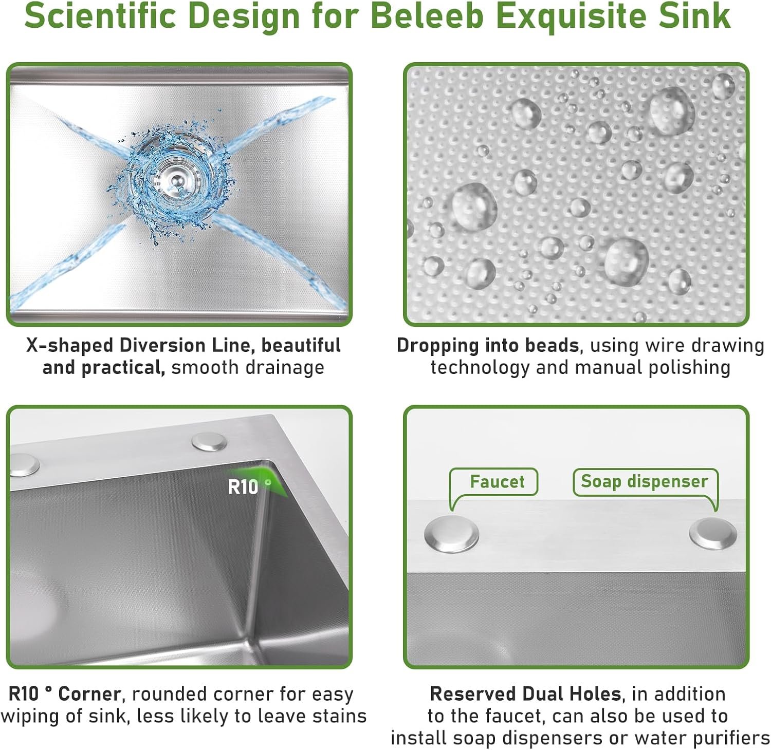 3D EMBOSSED FINISH: The Beleeb 28-Inch Drop-In Kitchen Sink boasts a captivating miniature bead embossing finish, adding a touch of sophistication and modern elegance to your kitchen decor. The 3D miniature bead embossing finish boasts rounded, smooth protrusions that minimize friction and prevent scratches, stains, and oil build-up