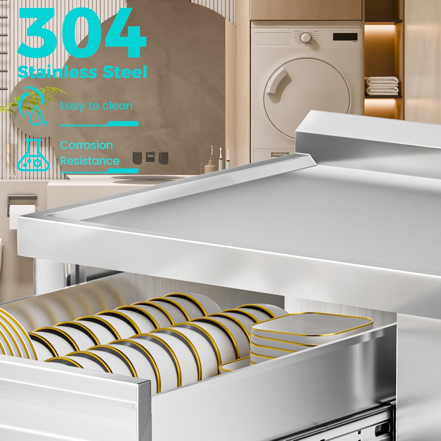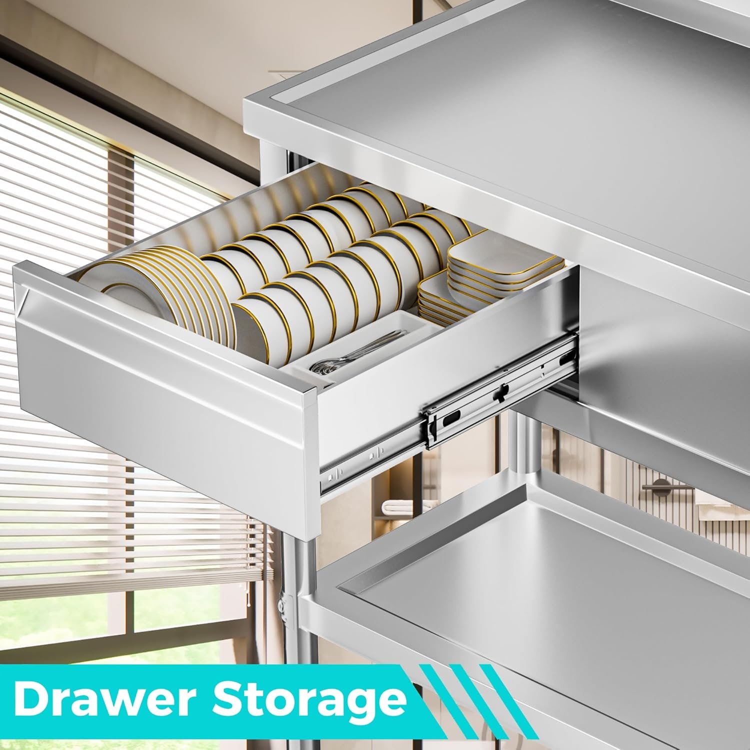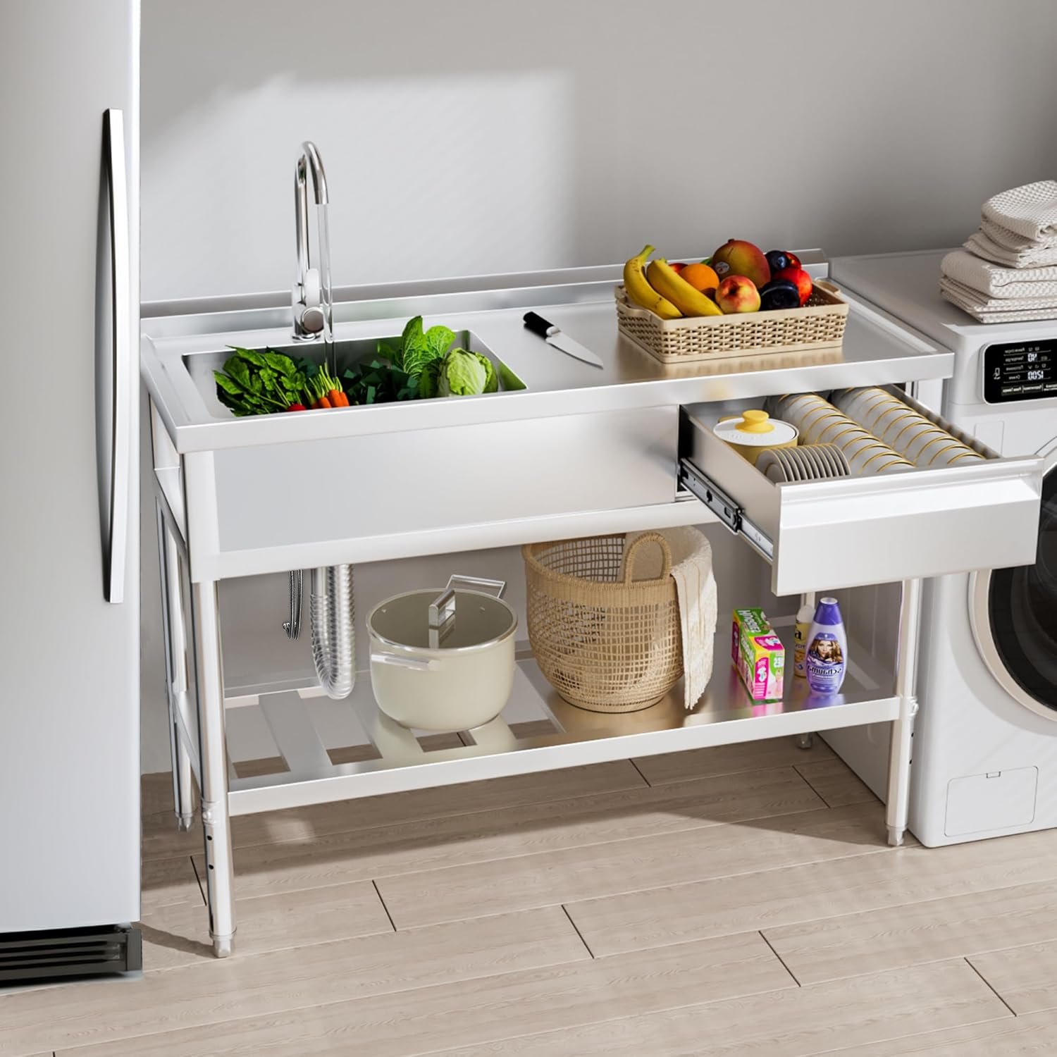【Versatile Free-Standing Utility Sink】 Upgrade your workspace with the WOEDEN 39” stainless steel utility sink (overall dimensions: 39″W x 35.5″H x 19.5″D), featuring a spacious workbench, a deep washbasin (inner bowl size: 17 x 13 inches), a smooth-gliding storage drawer, and an adjustable bottom shelf. This free-standing commercial sink is perfect for laundry rooms, farmhouses, garages, outdoor BBQs, and professional kitchens.