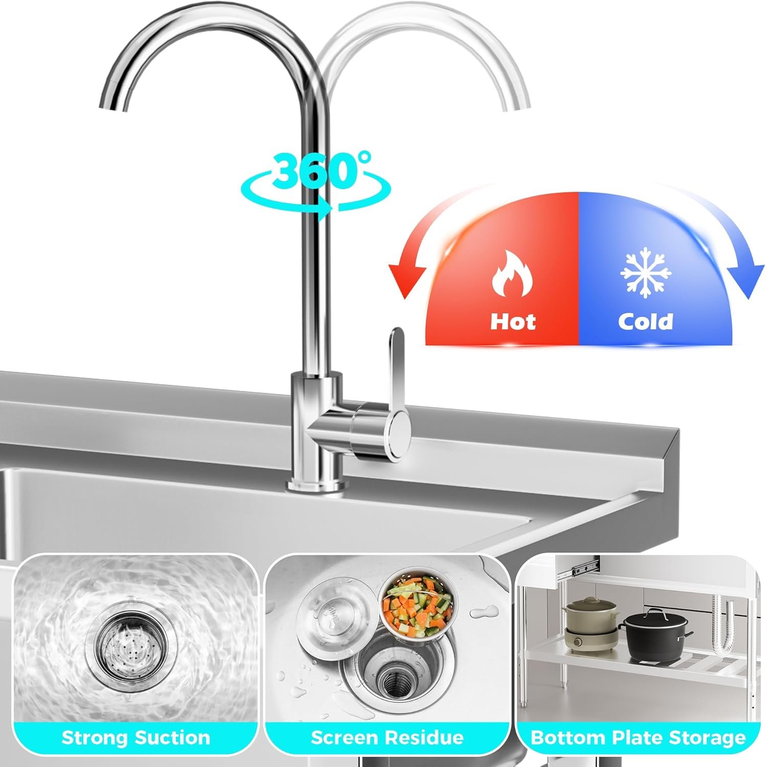 【Efficient Drainage System & 360° Faucet】 Equipped with a high-efficiency drainage system, this commercial sink features a removable strainer and an anti-clog stainless steel drain to prevent blockages. The gooseneck faucet rotates 360°, providing full-range water flow for easy washing. With hot & cold water pipes included, you can quickly adjust temperatures to suit various cleaning tasks.