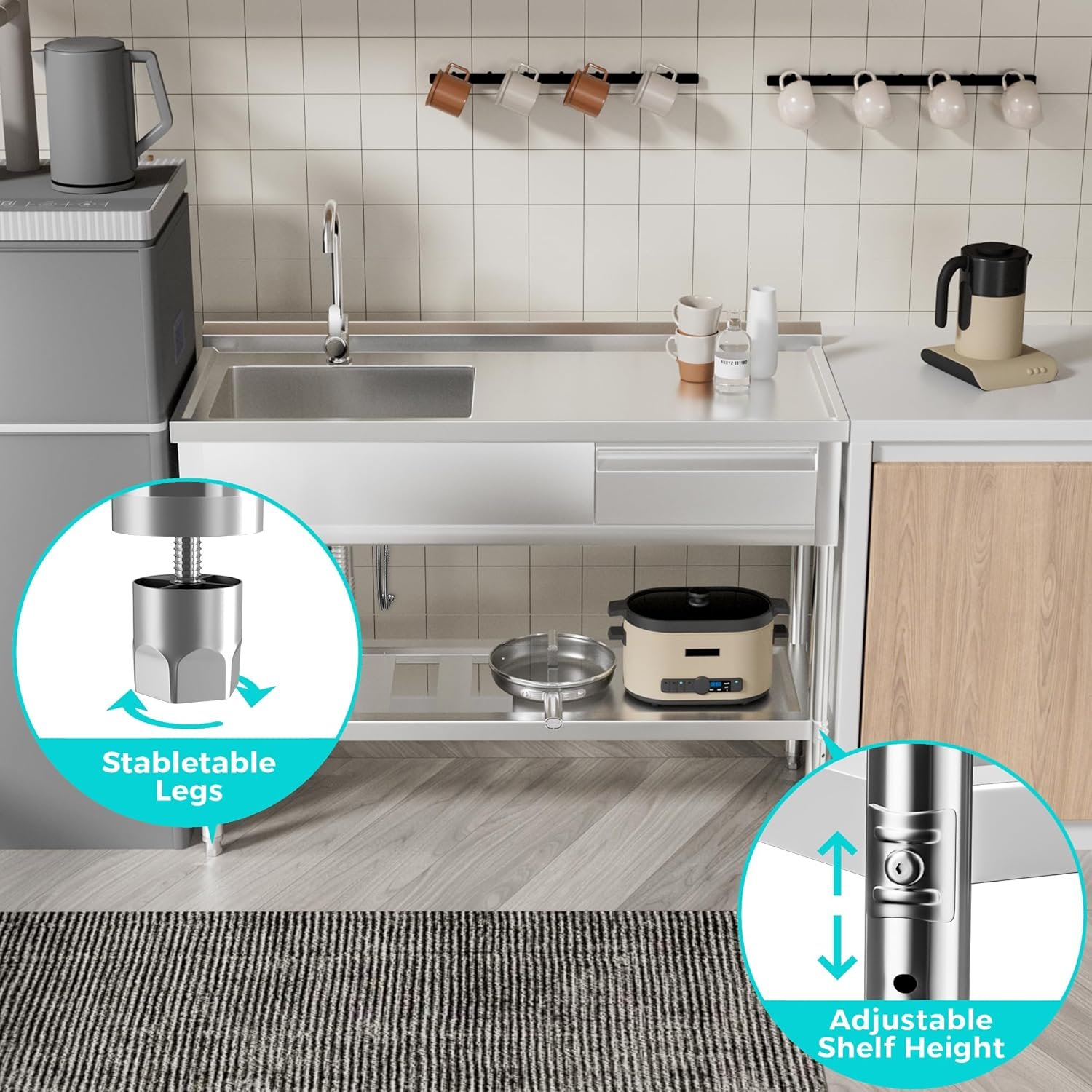 【Spacious Workbench & Smart Storage】 Unlike standard sinks, this upgraded utility sink includes a built-in workbench for enhanced efficiency. The large-capacity drawer allows easy access to frequently used tools and supplies, while the reinforced bottom shelf provides ample space for detergents, buckets, or cookware. The adjustable legs ensure stability on uneven surfaces, making it a versatile addition to any workspace.