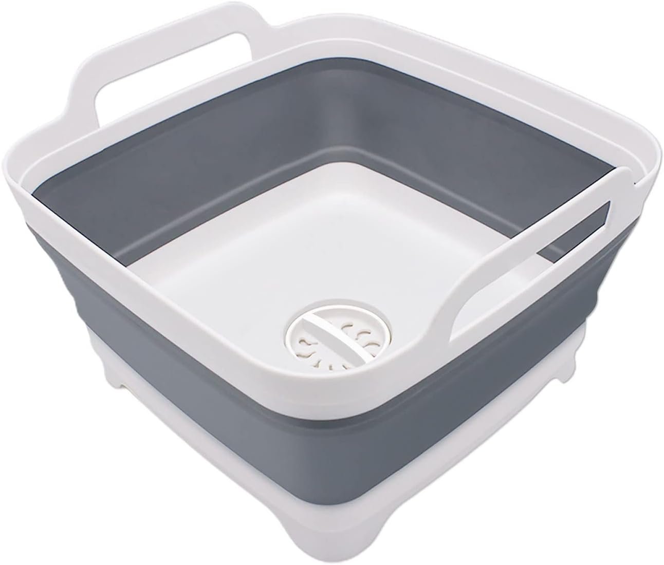 2.4 Gal(9L) Collapsible Dish Basin with Drain Plug, Space Saving Outdoor Multiuse Foldable Sink Tub, Dishpan, Kitchen Storage Tray for Camping, Vegetable Washing, RV (Gray)