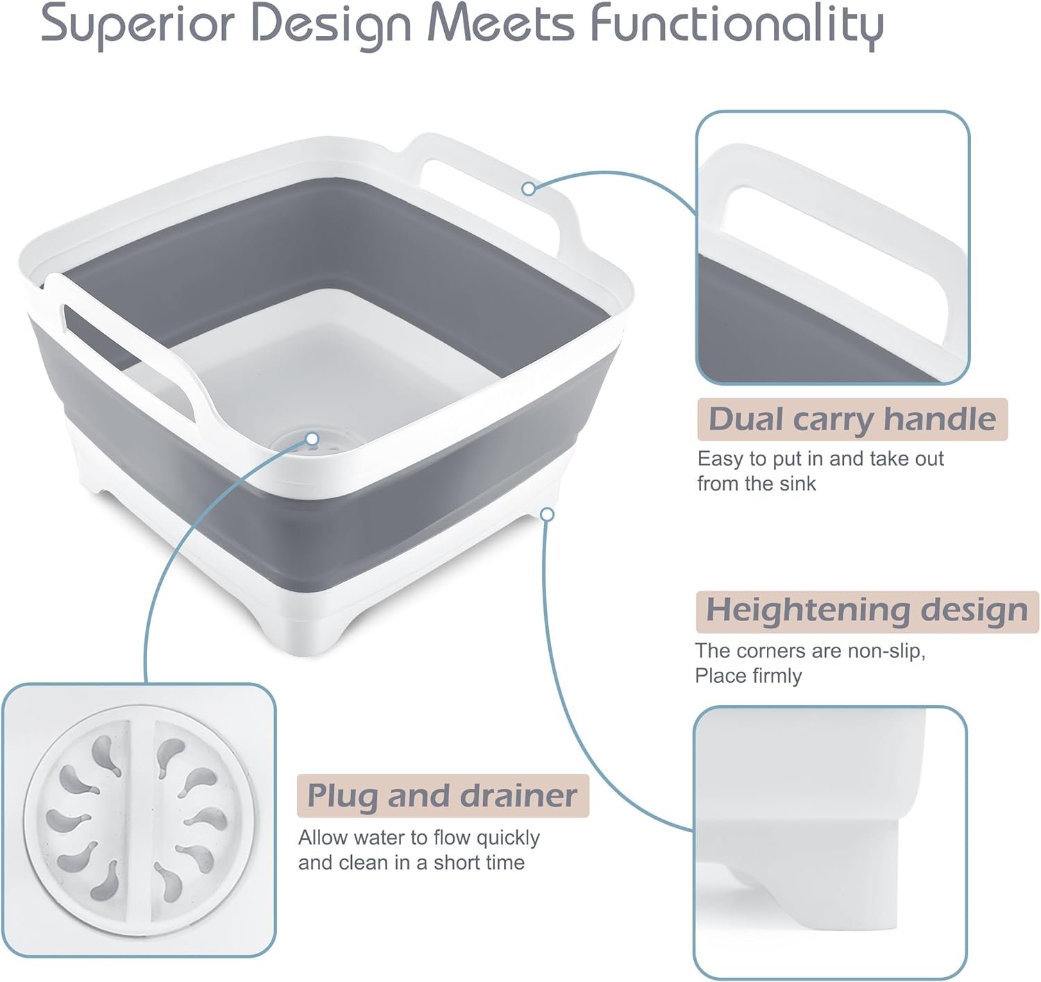 【Space-Saving and Foldable】The dish basin feature a foldable design so that you can adjust the size as needed. It collapses easily for storage and takes up very little space.Expanded size:12.4 x 12 x 7.9(h) inches.Collapsed:2.8 inches. The Interior bottom dimension is about 10.1 x 10.1 inches. Capacity: 9L / 2.4 gallon.