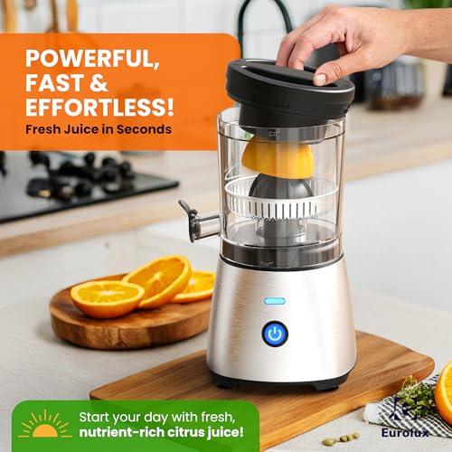 Eurolux Electric Citrus Juicer Stainless Steel | Premium Hands-Free One-Touch Orange Juice Squeezer for Oranges, Lemons, and Limes | Quiet Operation, Easy to Clean, Countertop Small Kitchen Appliance