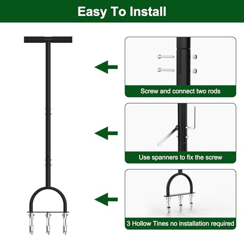 EASY TO INSTALL: You will get a T-Hanle pole, a pole , installed 3 core tines pedals, two anti-slip nuts, and two wrenches. It arrives with the tines already fitted to the frame, just install the middle connecting rod and you can use it. TIPS: If your soil is dry and hard, water your lawn first for optimal performance with the aerator tool.
