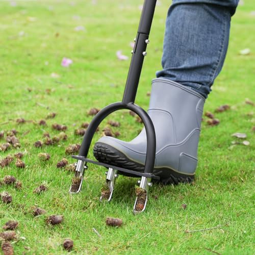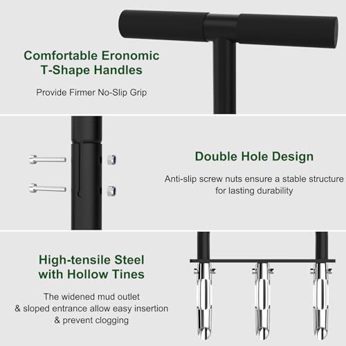 UNIQUE DESIGN TO PREVENT CLOGGING: Unlike other manual aerators, our plug aerator features tines made from solid high-carbon steel, carefully engineered with an internal widening chamber. This design ensures that soil cores have plenty of room to pass through without getting stuck, keeping the aerator running smoothly.