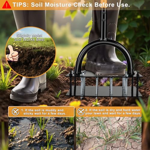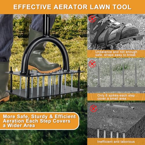 【Heavy Duty & Rust-Resistant Build】Crafted from reinforced iron with powder-coated protection, this yard aerator tool withstands heavy foot pressure and tough soil. The welded footplate and spike base ensure stability and long-lasting durability. This lawn aerator tool is built to last.