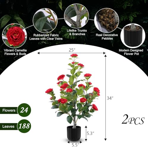 Package:2 artificial red camellia tree – 35inch. It comes with the vivid camellia appearance, which is full of the romantic atmosphere. Use immediately straight out of the box.