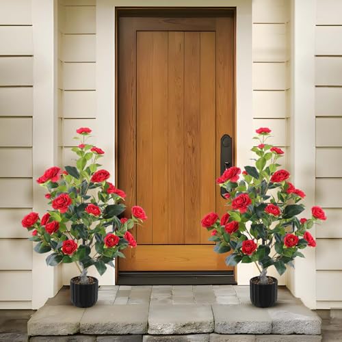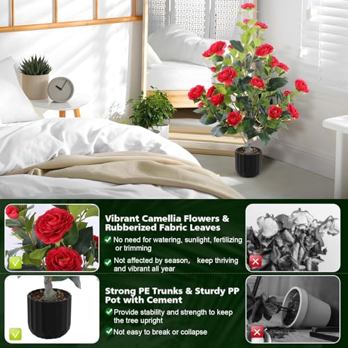 Hananona 2 Pcs Artificial Camellia Trees Faux Camellia Plant in Pot with Flowers Indoor Plants for Spring Home Decor Outdoor Porch Front Door Decor (Red, M)